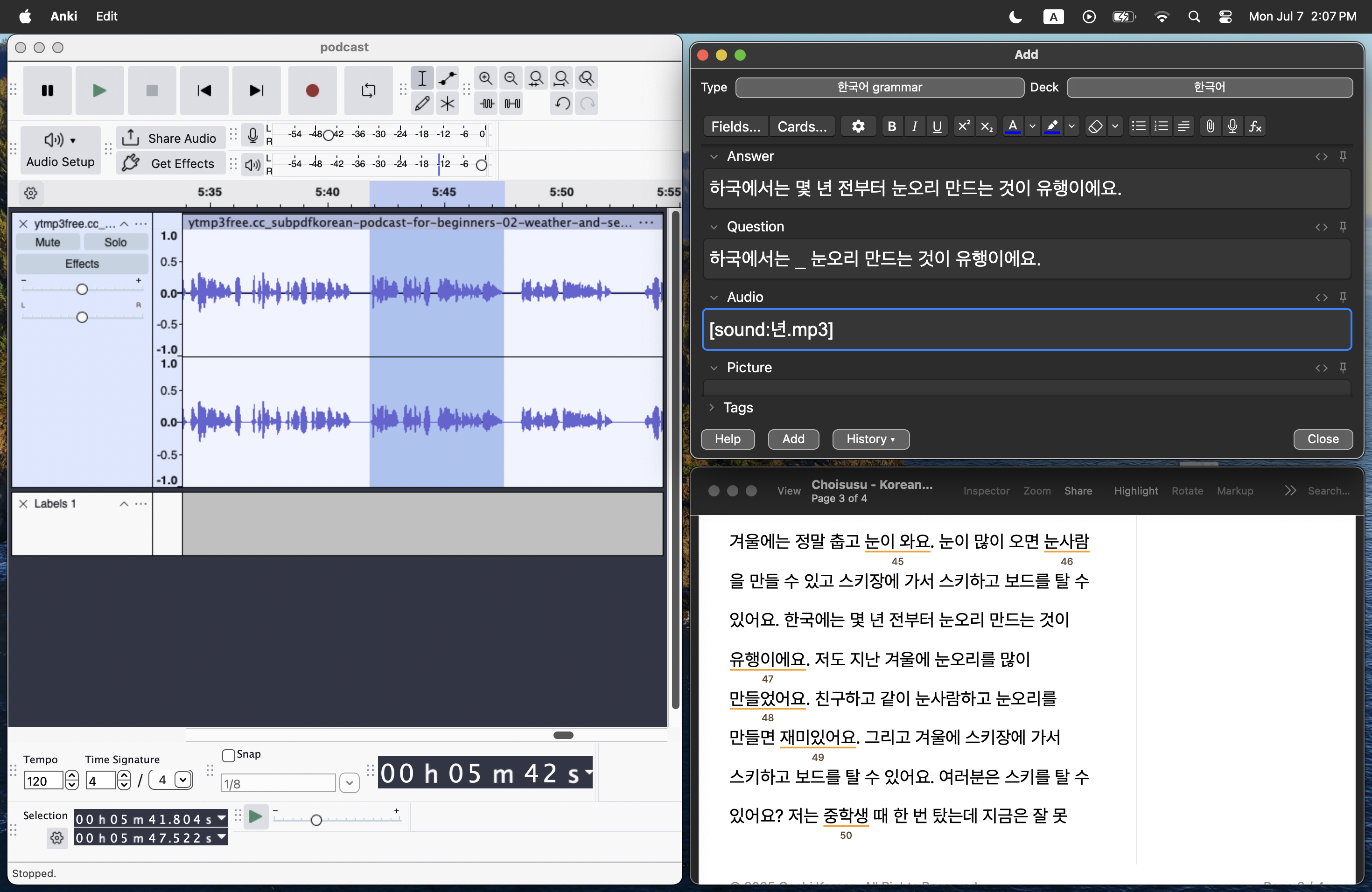 Since there isn’t necessarily an outline of vocabulary and grammar to study, I have been pretty selective with the snippets. Only if I know I won’t remember it or if I want to train my ears more to recognize that word/grammar, will I add it to Anki.